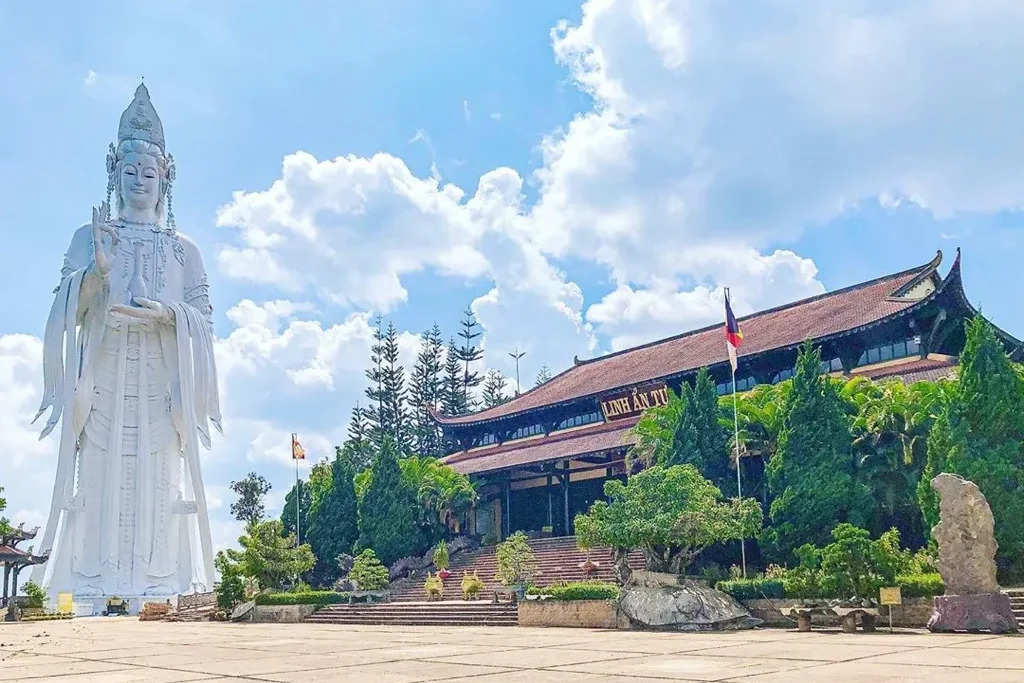 Chùa Linh Ẩn – Nơi Có Tượng Quan Âm Lớn Nhất Lâm Đồng: Tọa lạc tại thị trấn Nam Ban, huyện Lâm Hà – cách trung tâm Đà Lạt khoảng 27km. Đây là một trong những ngôi chùa nổi tiếng và linh thiêng bậc nhất Đà Lạt, được bao quanh bởi núi non hùng vĩ và thác nước hoang sơ.